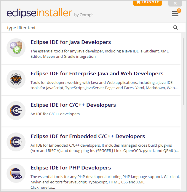 다운로드 후 설치 파일을 실행하면 다음과 같이 선택 화면이 나온다. 이클립스는 여러가지 언어를 지원 하지만 대다수 웹 개발을 시작 할 땐 Java를 선택한다.