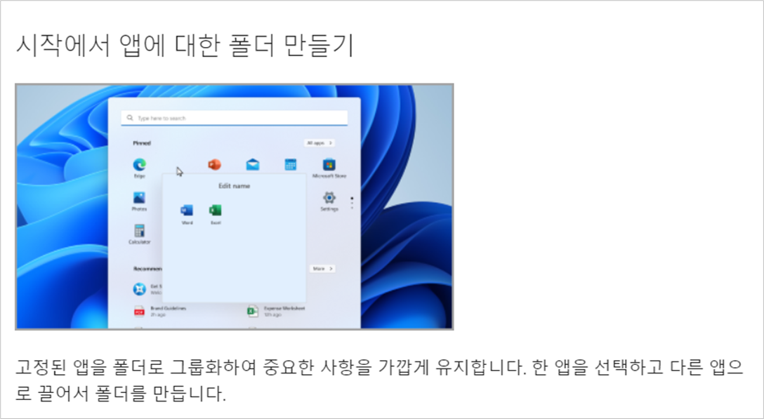 1. 고정된 시작 화면(시작 메뉴) 앱 폴더 기능.